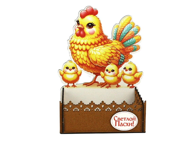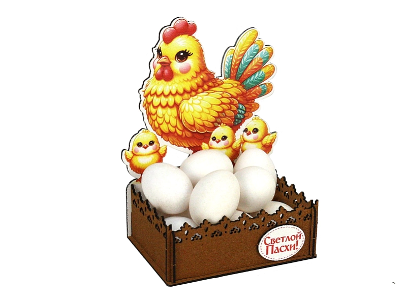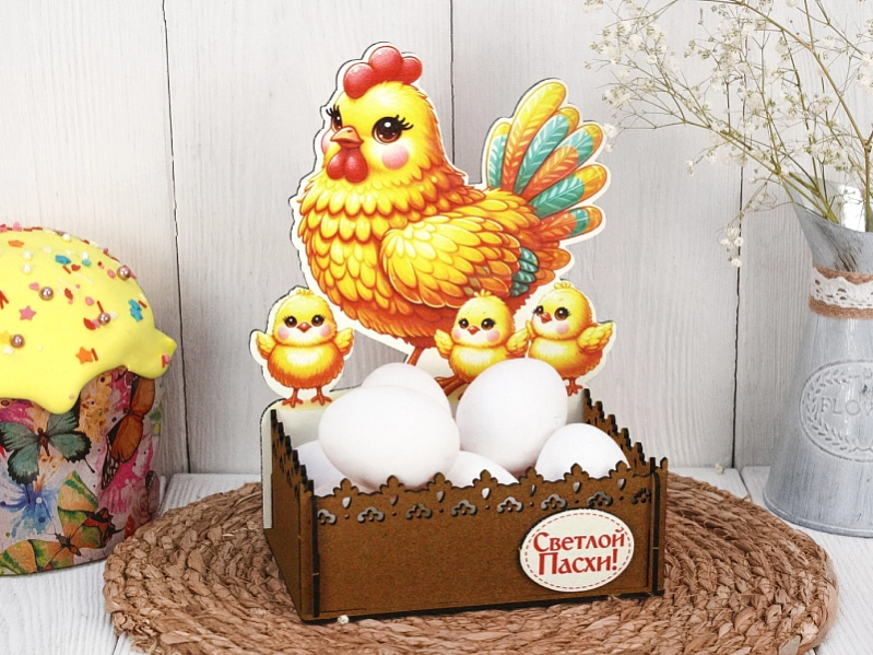 Эта очаровательная подарочная упаковка в форме домика с изображением мамы-курицы и цыплят станет прекрасным дополнением к вашим пасхальным подаркам! 🐣 Изготовленная из прочного МДФ, она не только красива, но и долговечна. 🎁