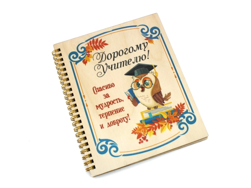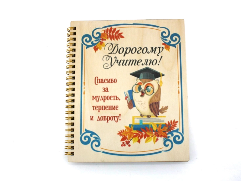 Блокнот на пружине "Дорогому учителю!" с совой (21*18*1,5) Фанера 3мм, УФ печать, оформл., 1 шт.