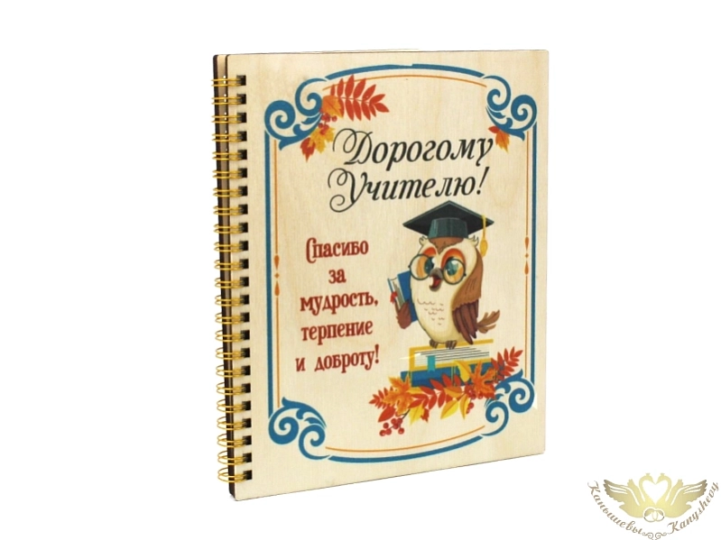 Бл35-00-0001 Блокнот на пружине "Дорогому учителю!" с совой (21*18*1,5) Фанера 3мм, УФ печать, оформл., 1 шт.