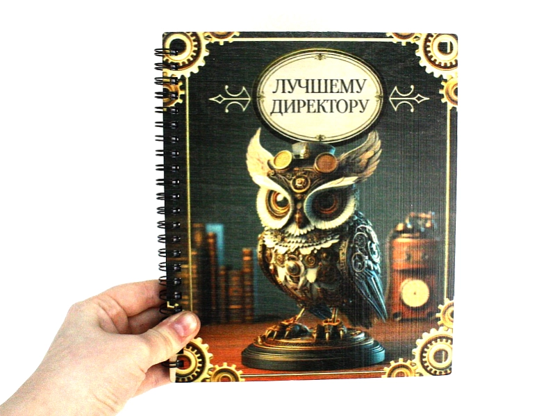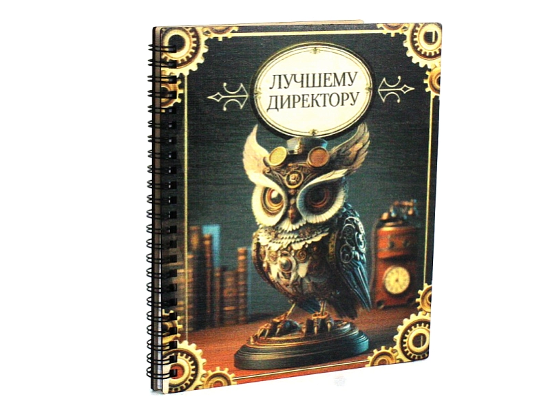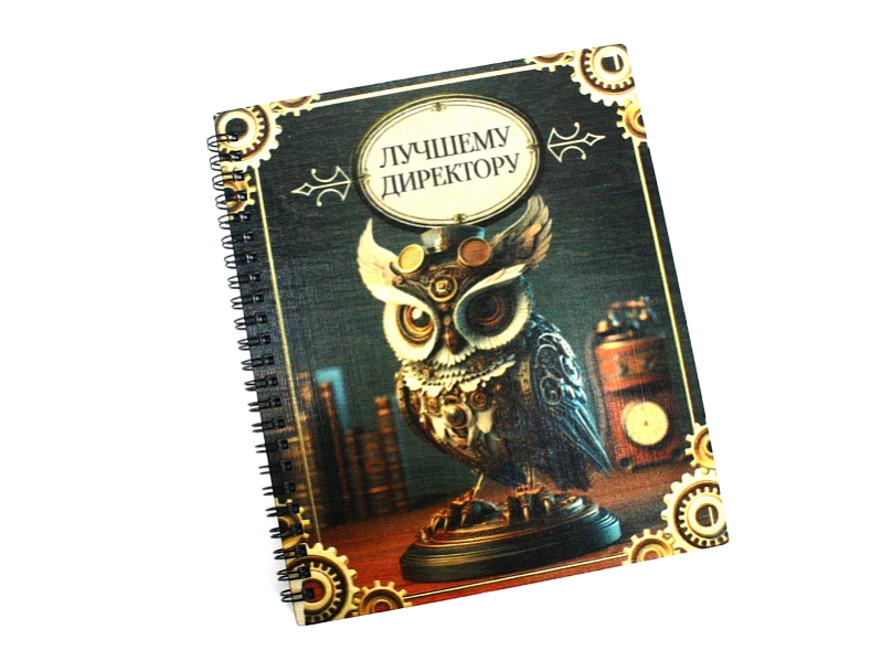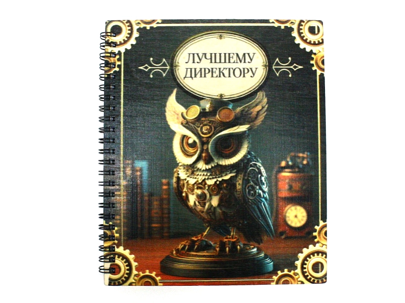 Блокнот на пружине "Лучшему директору" Сова стимпанк (21*18*1,5) Фанера 3мм, УФ печать, оформл., 1 шт.
