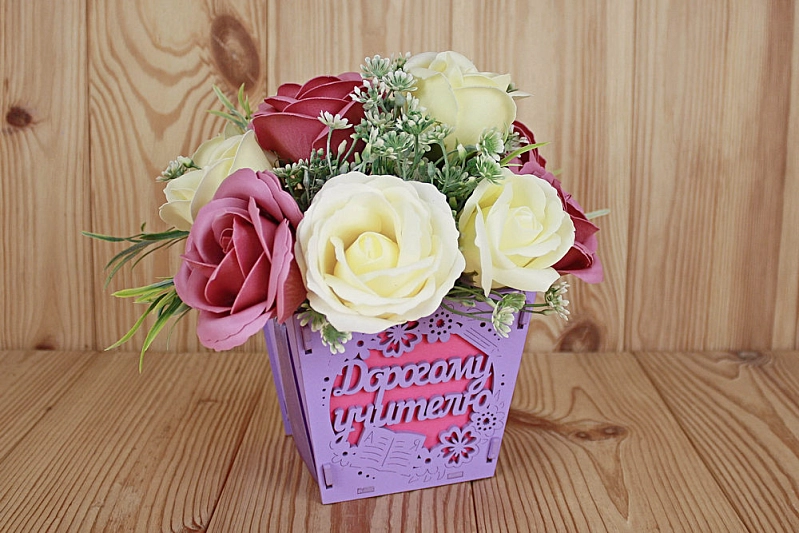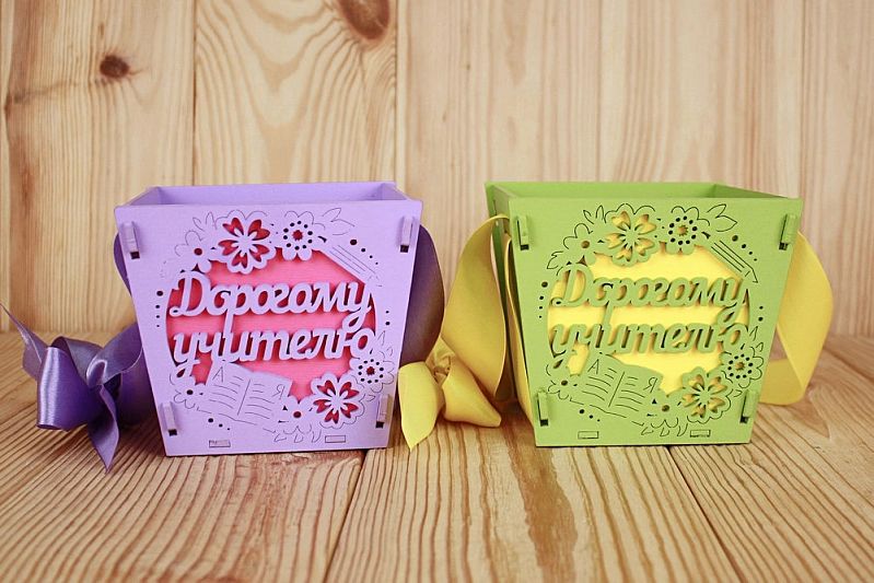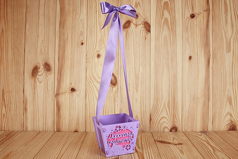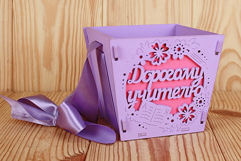 ПУ654-02-0910 Подарочная упаковка-конус "Дорогому учителю" средняя (12*12*10,5) МДФ 3мм, окрашен., оформл., Сиреневый-малиновый, 1 шт.