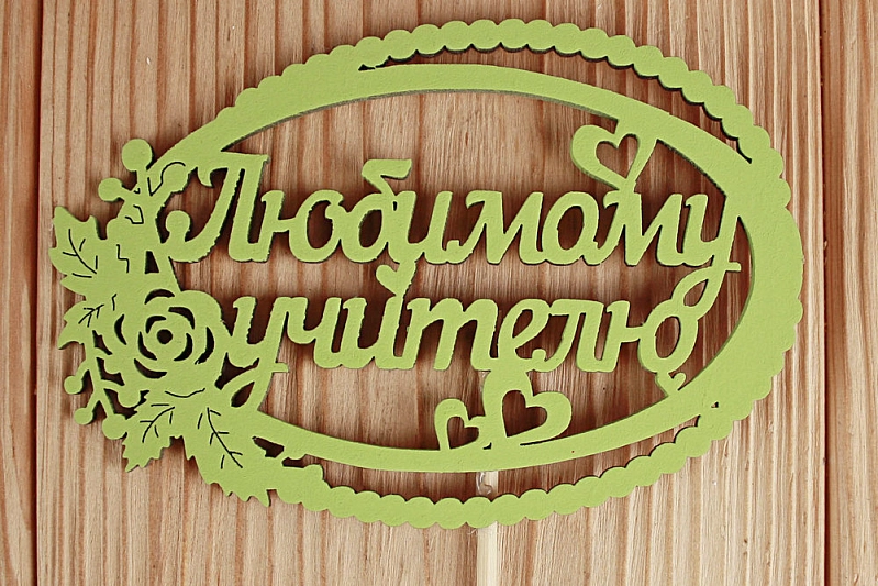 Топпер "Любимому учителю" в овале (12*30) МДФ 3мм, окрашен. на шпажке, Салатовый, Уп-10 шт.