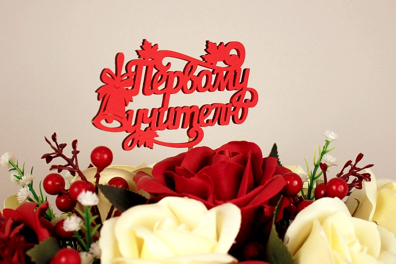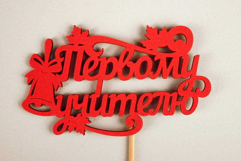 Топпер "Первому учителю" (9,5*28) МДФ 3мм, окрашен. на шпажке, Красный, Уп-10 шт.