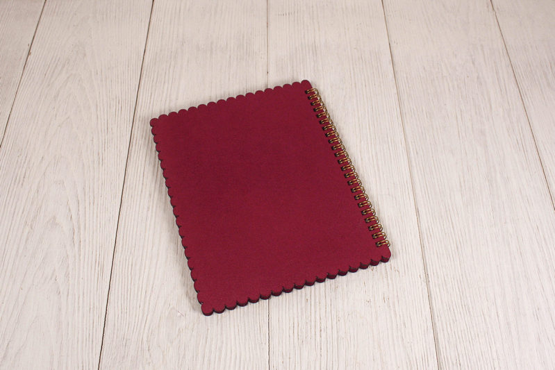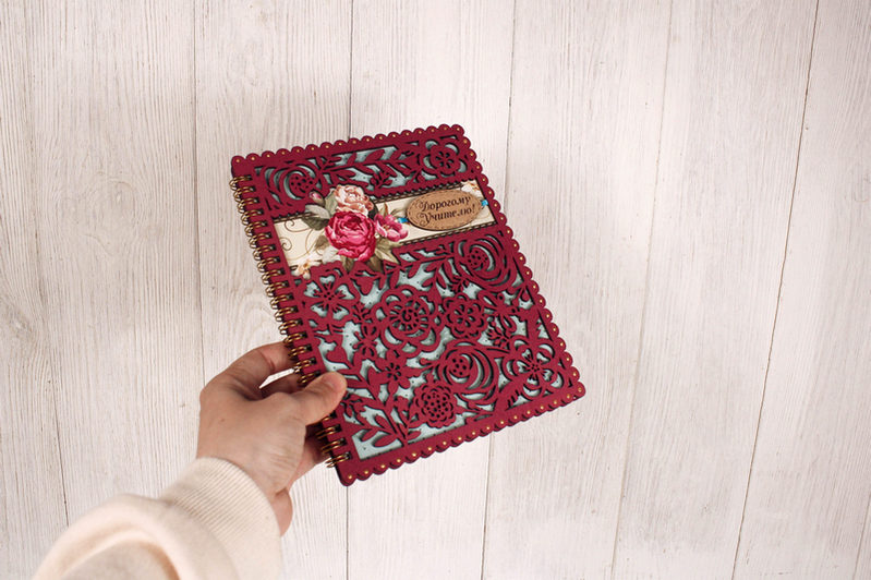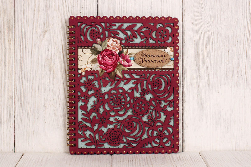 - Оформление: Блокнот окрашен морилкой и декорирован, что придает ему изысканный и неповторимый вид.