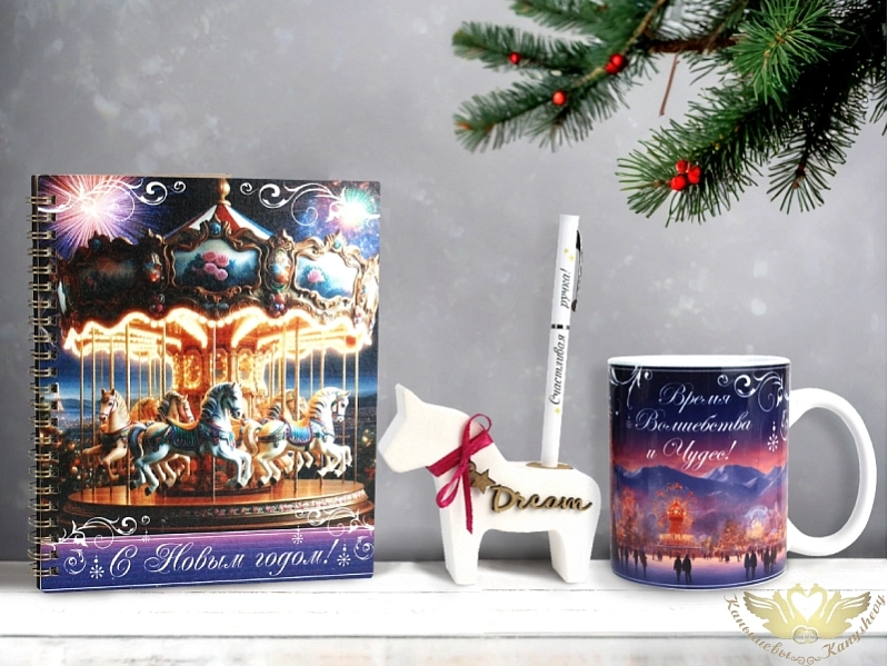 Подарочный набор "Новогодняя карусель". Набор: блокнот, кружка, ручка с подставкой.