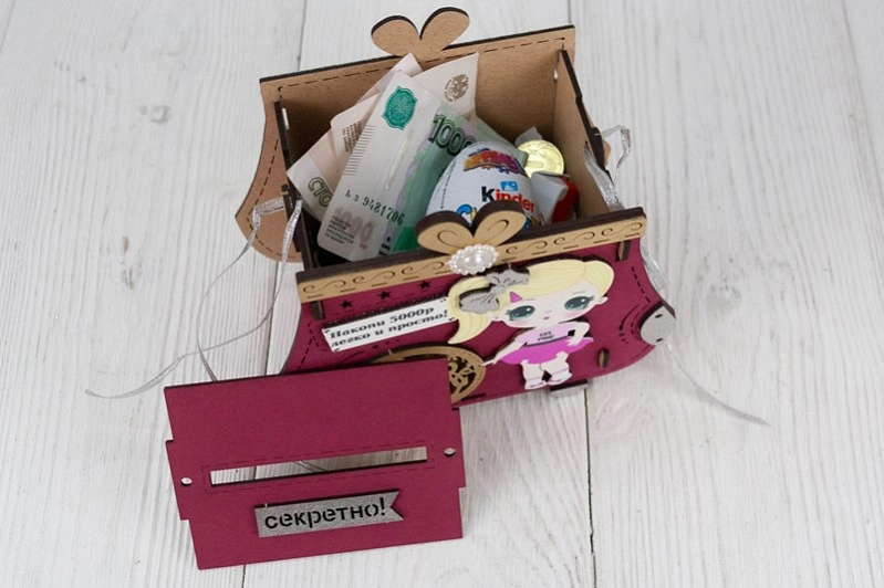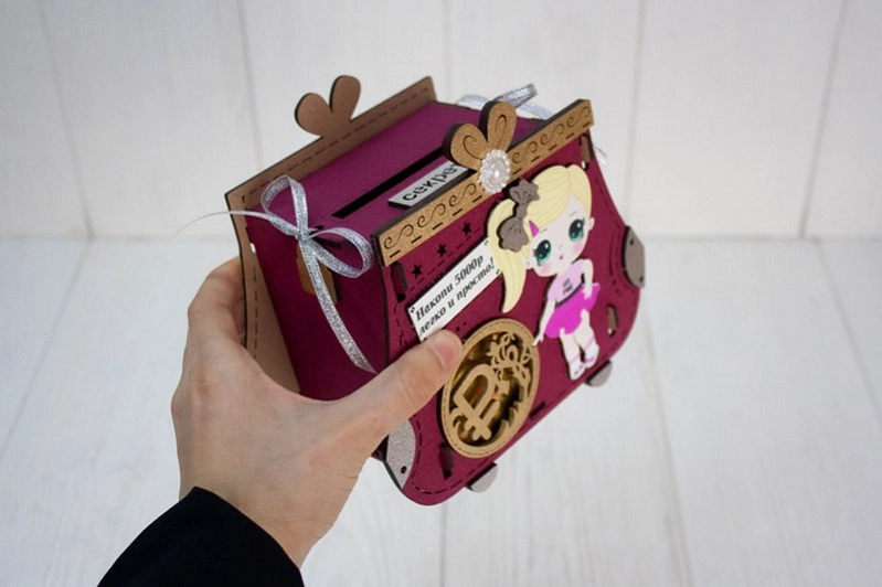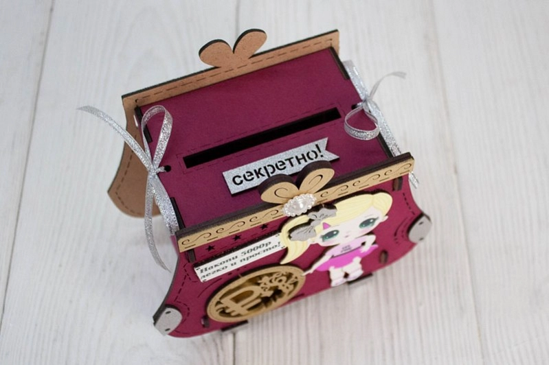 Копилка "Сумочка" с куклой (16,5*9,5*14,5) МДФ, УФ печать, окраш. морилкой, оформл., Слива-серебро, 1 шт.