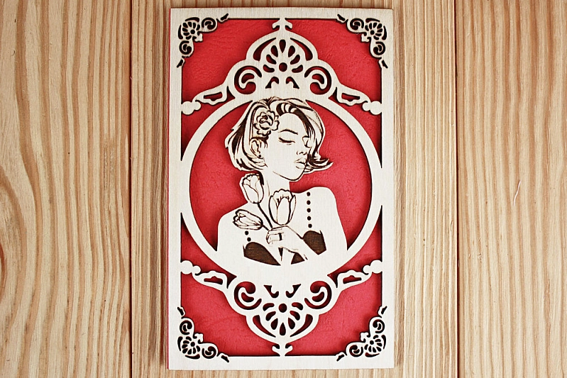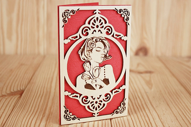 Открытка "Девушка с тюльпанами" (9*14) Фанера 3мм, картон, оформл., Красный, 1 шт.