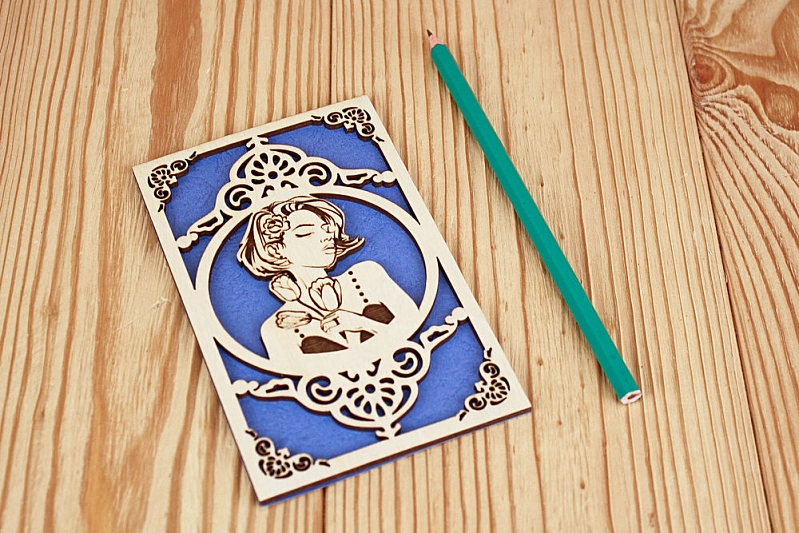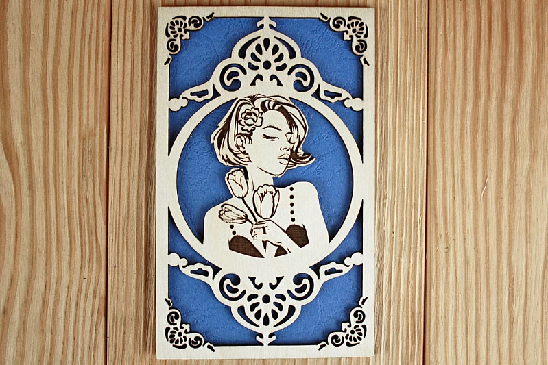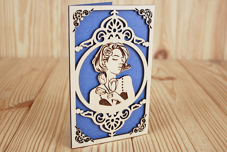 Открытка "Девушка с тюльпанами" (9*14) Фанера 3мм, картон, оформл., Синий, 1 шт.