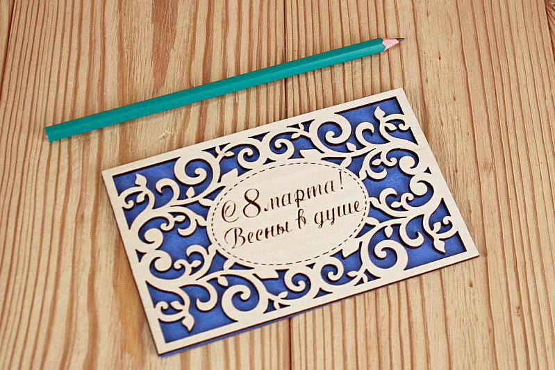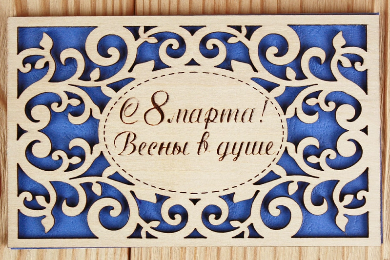Открытка "С 8 марта! Весны в душе!" (9*14) Фанера 3мм, картон, оформл., Синий, 1 шт.
