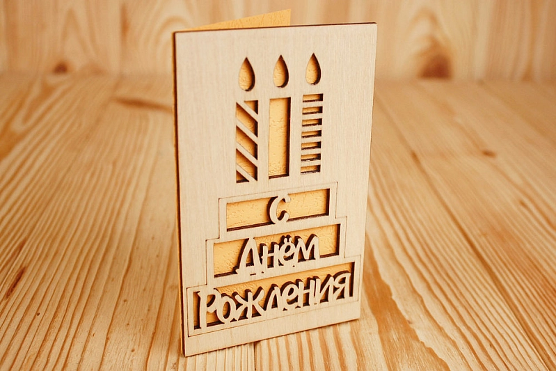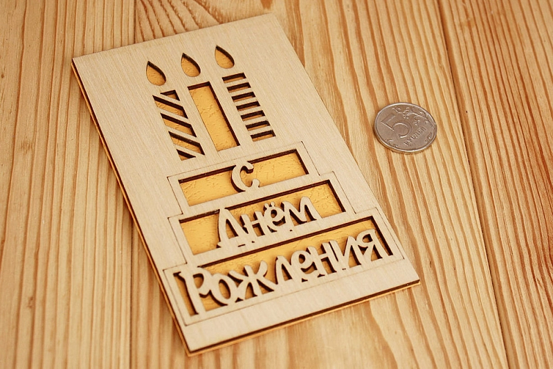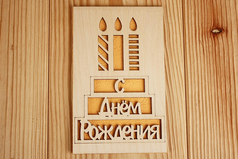 Открытка "С Днём рождения" с тортом (9*14) Фанера 3мм, картон, оформл., Желтый, 1 шт.