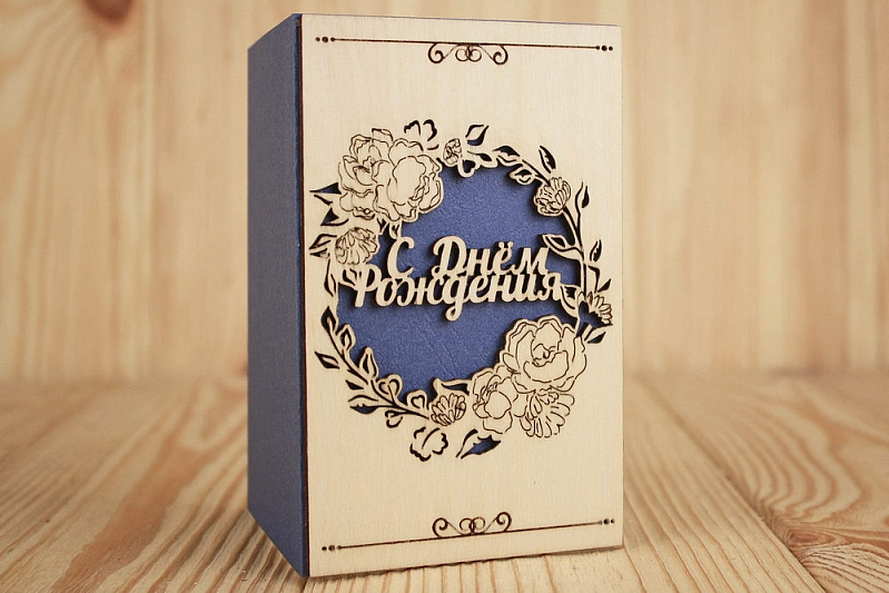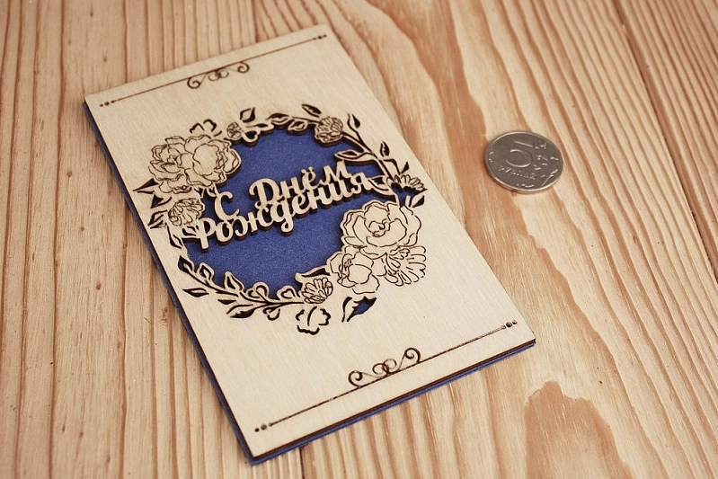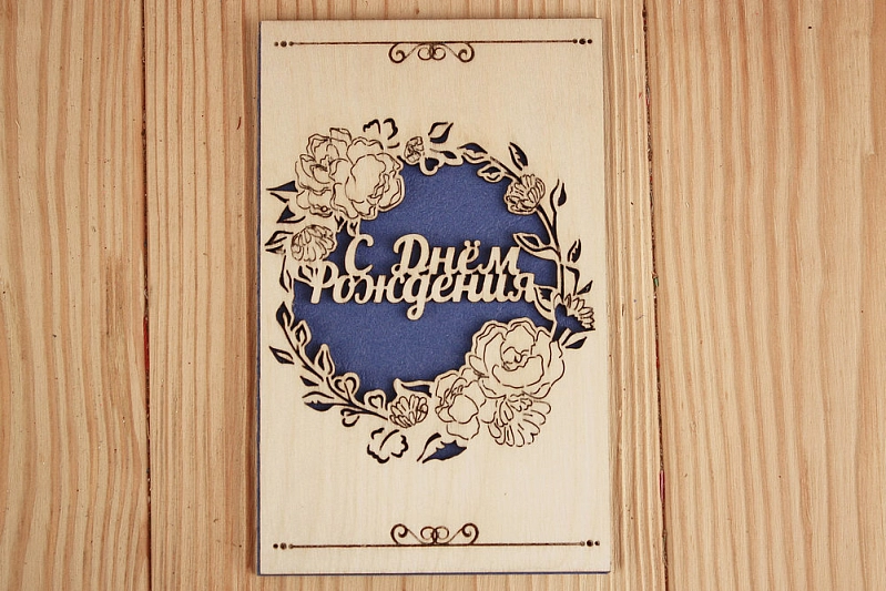 Открытка "С Днём рождения!" с венком из цветов (9*14) Фанера 3мм, картон, оформл., Синий, 1 шт.