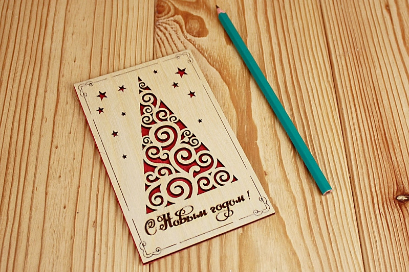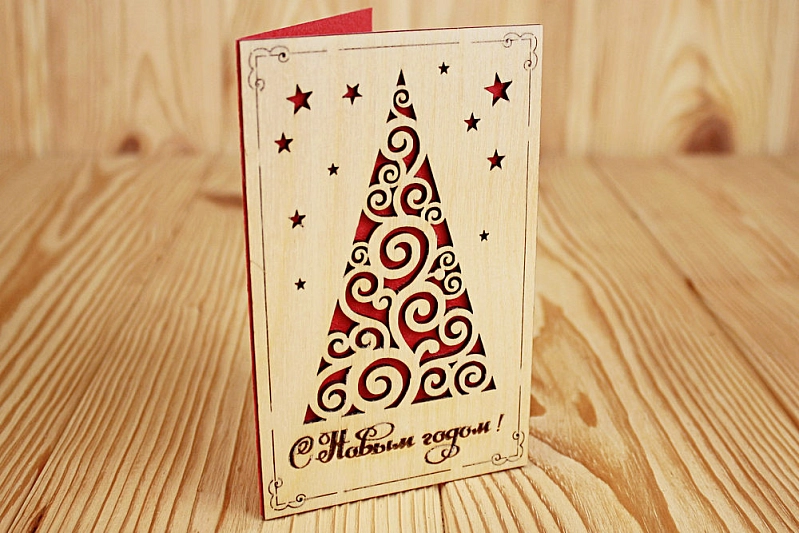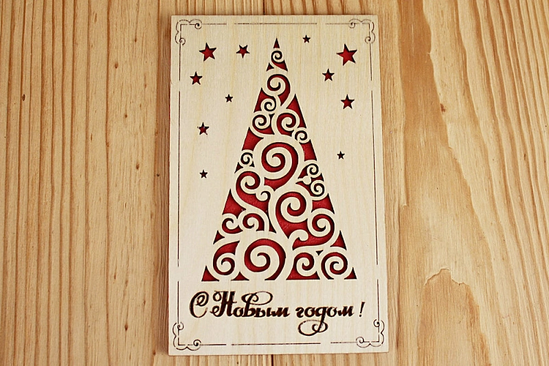 Открытка "С Новым годом!" с ажурной ёлкой (9*14) Фанера 3мм, картон, оформл., Красный, 1 шт.