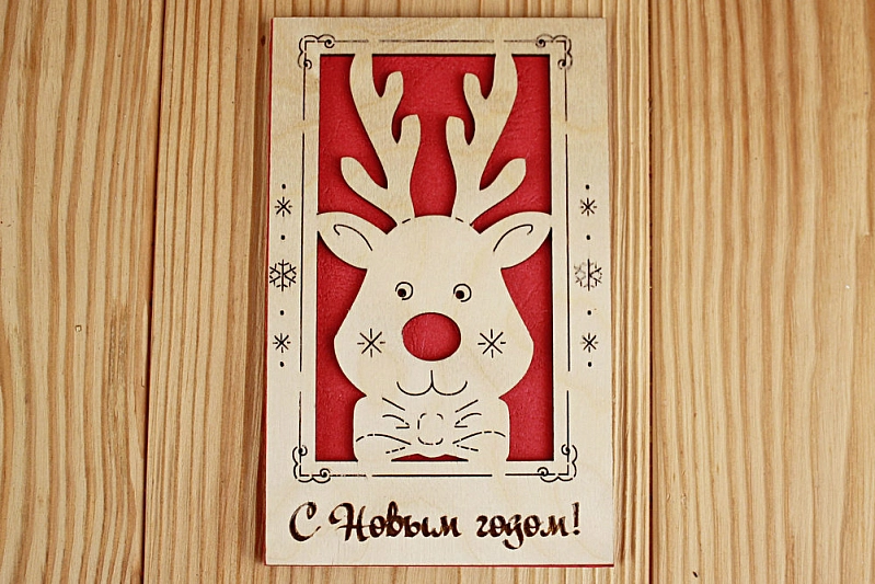 ОнгФ13-00-0006 Открытка "С Новым годом!" с оленем (9*14) Фанера 3мм, картон, оформл., Красный, 1 шт.
