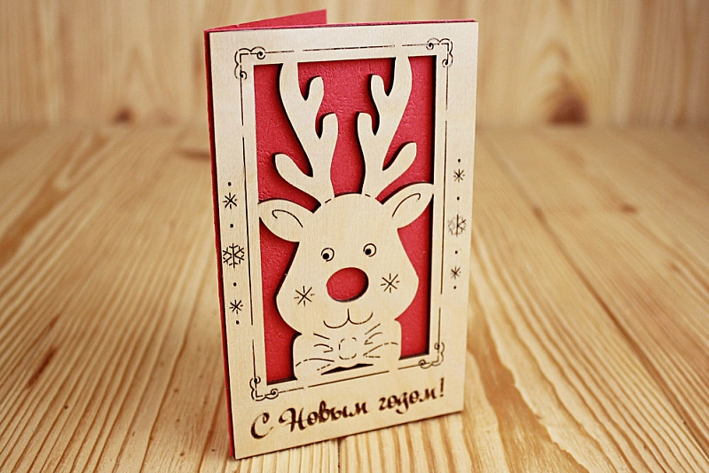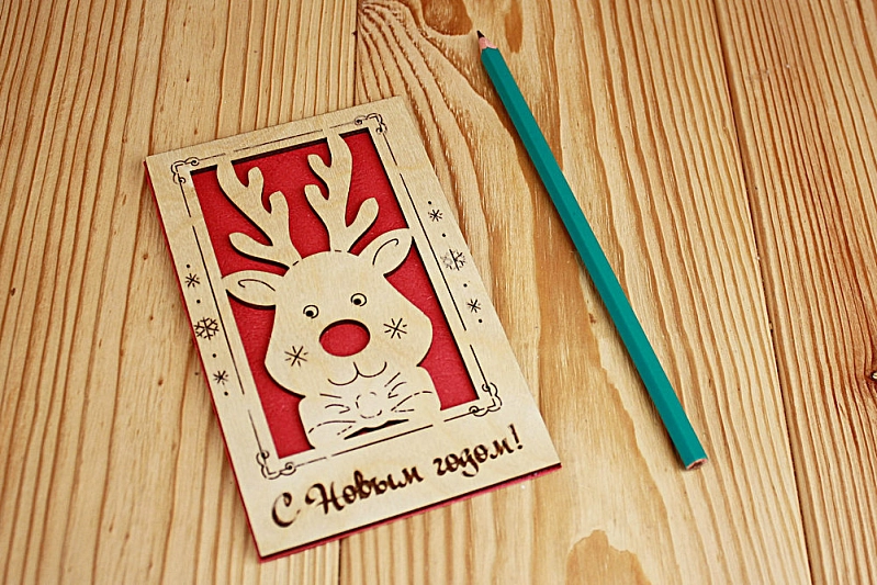 Открытка "С Новым годом!" с оленем (9*14) Фанера 3мм, картон, оформл., Красный, 1 шт.