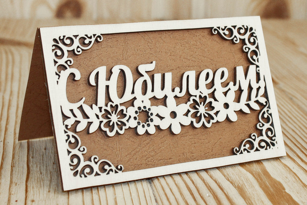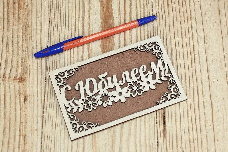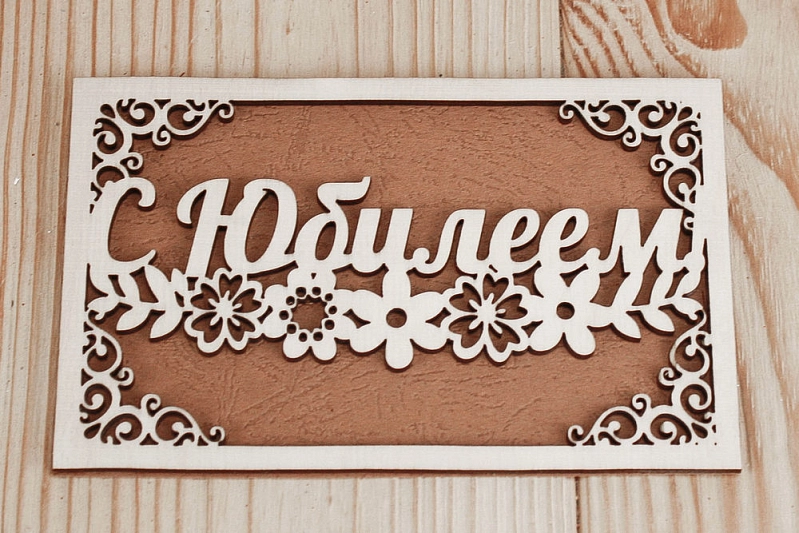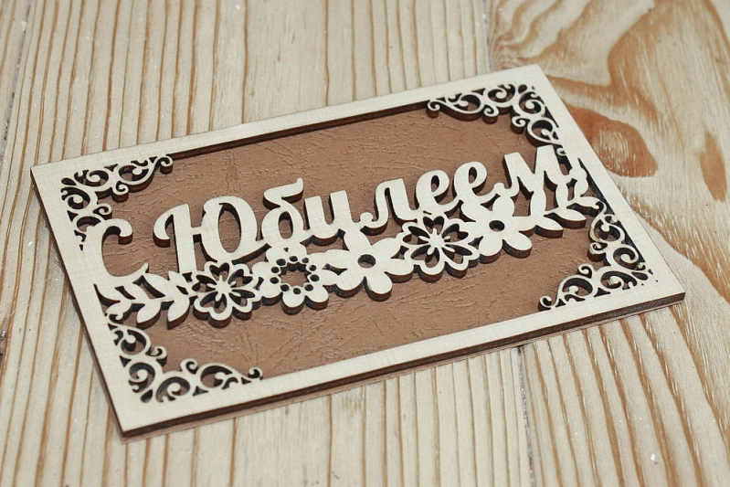 Открытка "С Юбилеем!" с цветами (9*14) Фанера 3мм, картон, оформл., Коричневый, 1 шт.