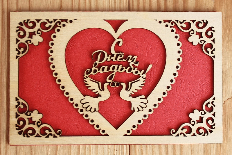 Открытка свадебная "С Днём свадьбы" с голубями в сердце (9*14) Фанера 3мм, картон, оформл., Красный, 1 шт.