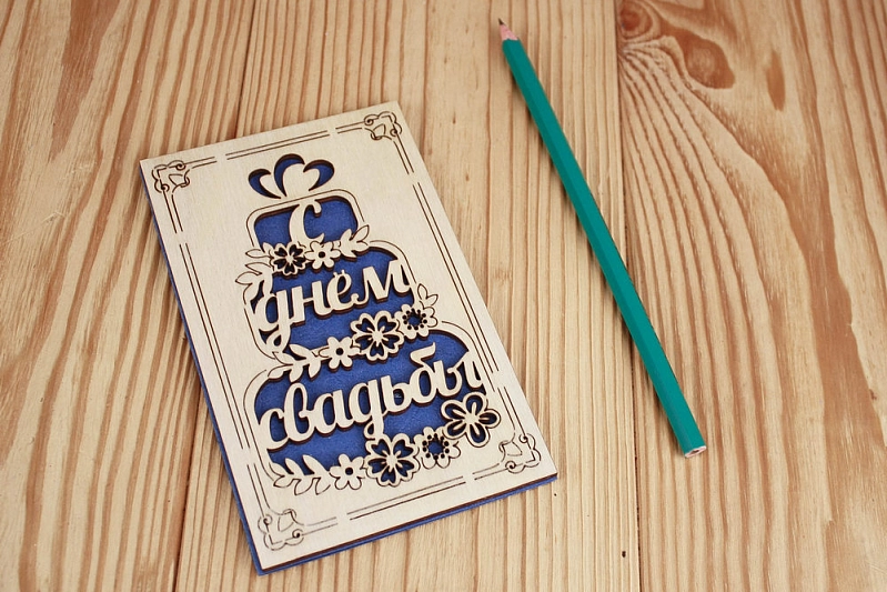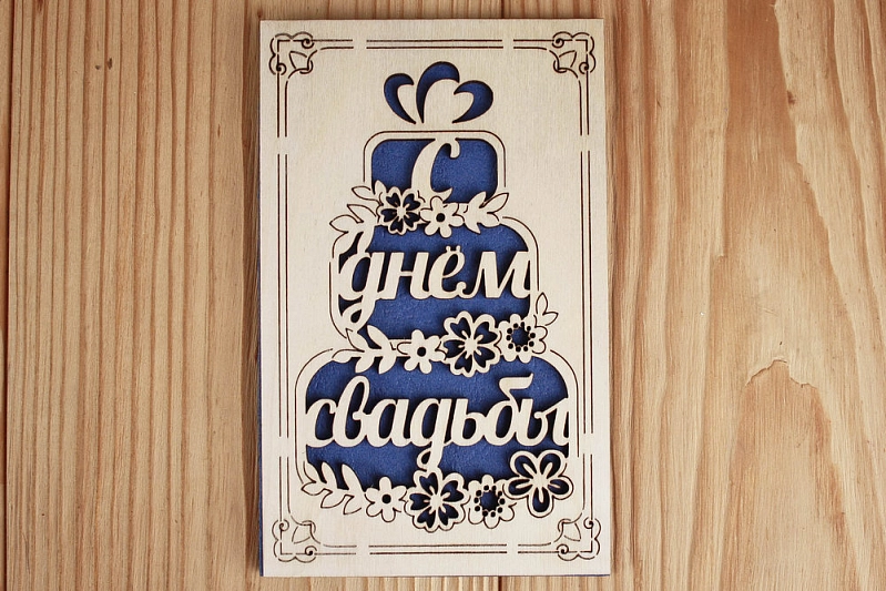ОпдФ19-00-0008 Открытка свадебная "С Днём свадьбы" с тортом (9*14) Фанера 3мм, картон, оформл., Синий, 1 шт.
