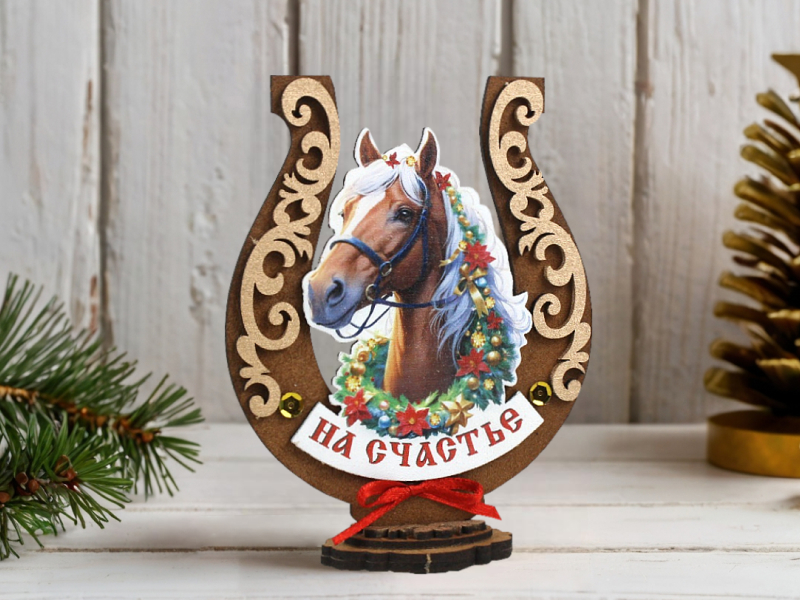 Сув851-02-3701 Сувенир-подкова на подставке "На счастье" с Лошадью" (10,5*3*13) МДФ, УФ печать, окраш. морилкой, оформл., Дуб-золото, 1 шт.