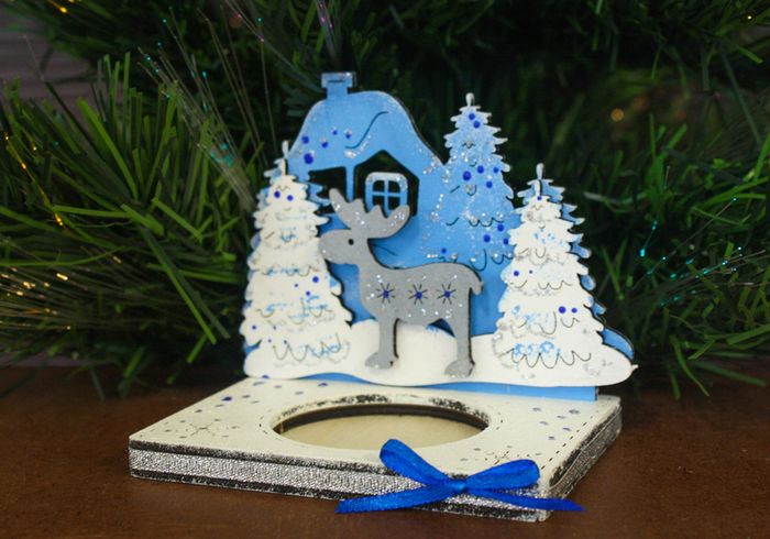 Сувенир-подсвечник "С оленем " (10*10) Фанера 3мм, окрашен., оформл., Белый-голубой, 1 шт.
