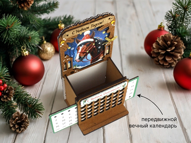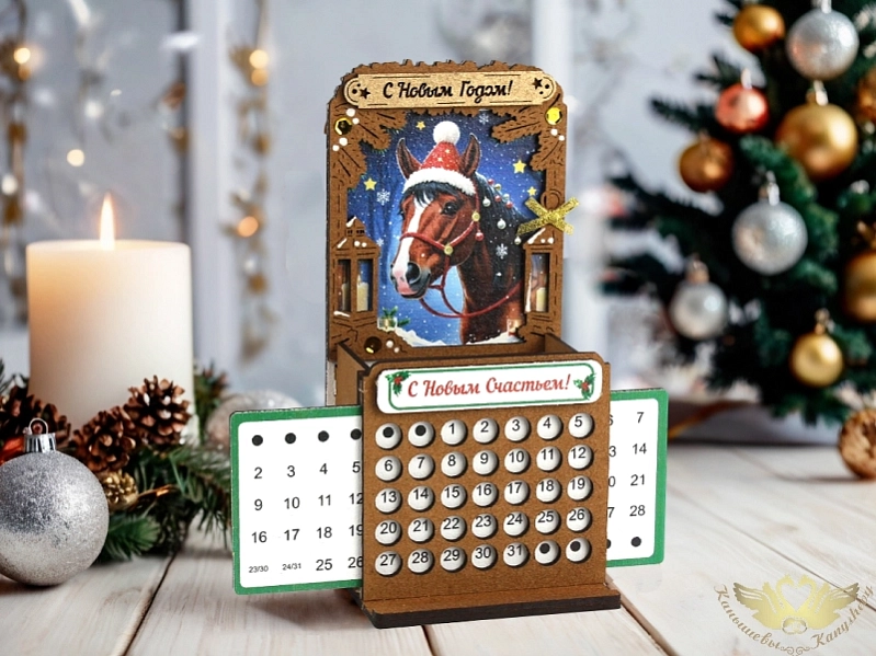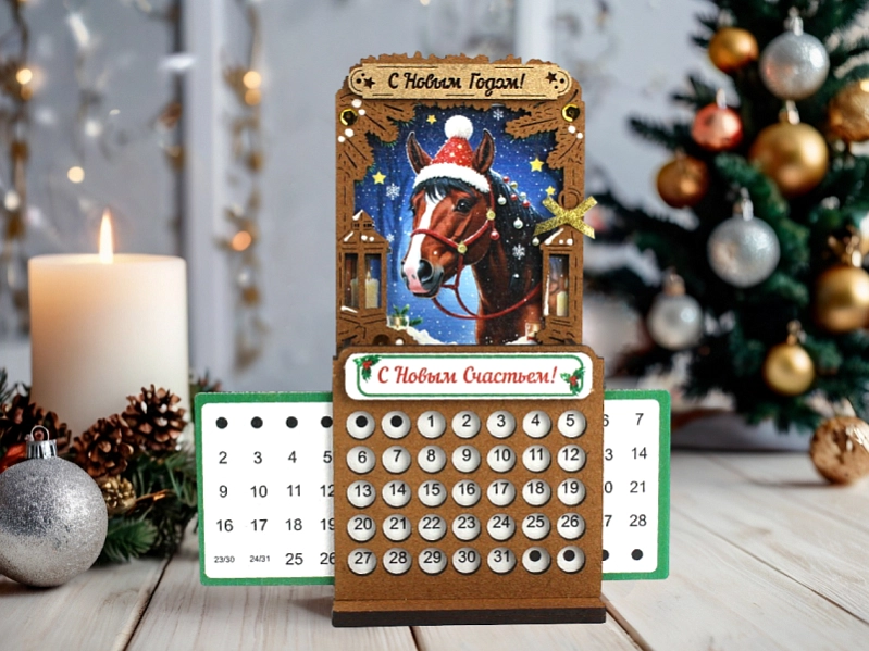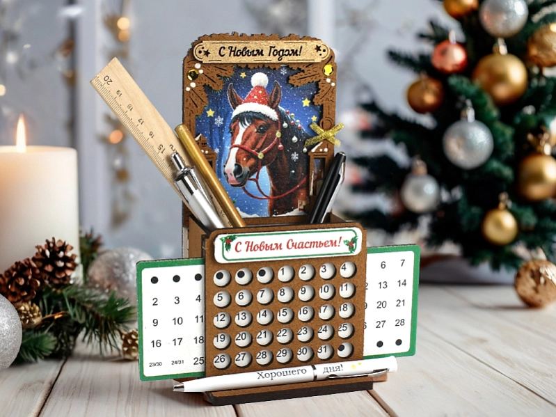 Прекрасное дополнение к новогоднему интерьеру и полезный аксессуар для рабочего стола! Этот стильный календарь-карандашница выполнен из качественного МДФ толщиной 3 мм и оформлен с помощью УФ-печати и морилки, что придает ему изысканный вид и долговечность. 🐎