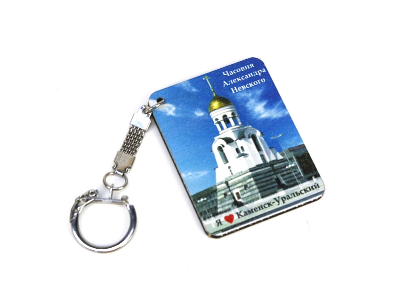 НК24 Брелок "Каменск-Уральский. Часовня А.Невского". МДФ, УФ печать, окраш. морилкой, оформл., 1шт.