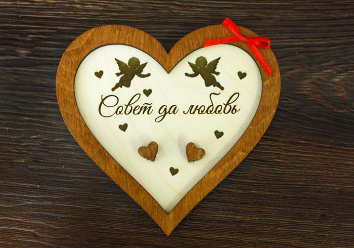 Сердечко под кольца "Совет да любовь!" (шир.14см;выс.13см) Фанера 3мм, окрашен. морилкой, оформл., Дуб, 1 шт.
