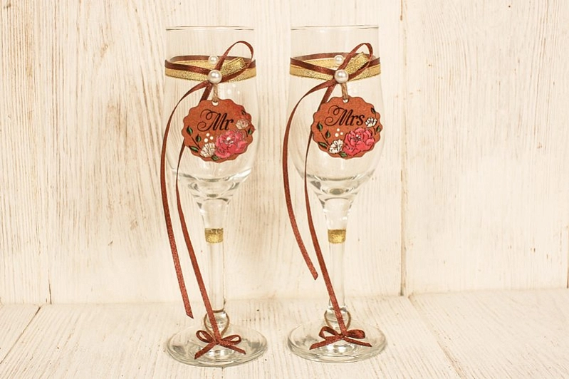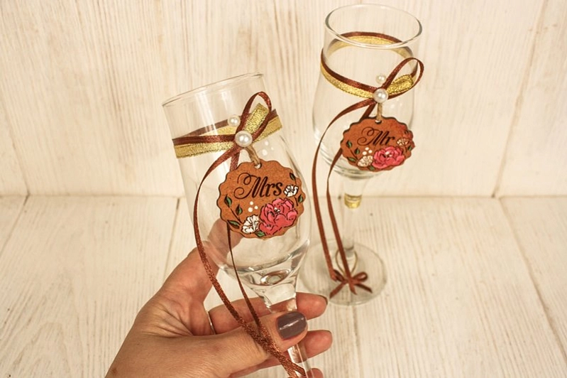 - Оформление: Бокалы окрашены морилкой и оформлены в нежном цвете Дуб-розовый, что придает им особый шарм.