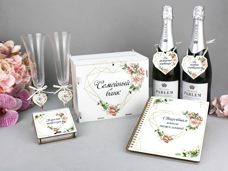 В наборе 5 позиций, которые идеально дополняют друг друга и создают единый стиль. Этот набор станет прекрасным подарком молодоженам или украшением вашего свадебного торжества. 🎁