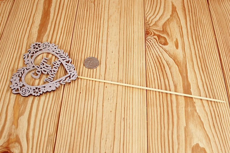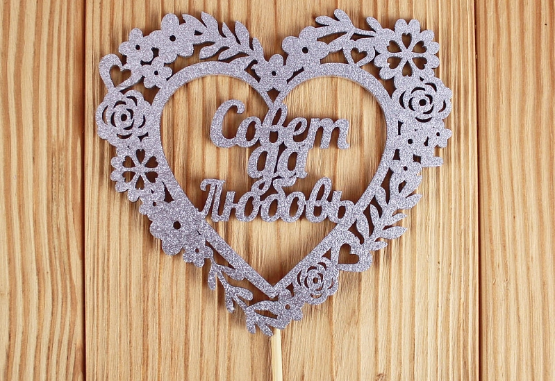 Топпер "Совет да Любовь" в сердце (10,5*30) МДФ 3мм, окрашен. на шпажке, Серебро, 1 шт.
