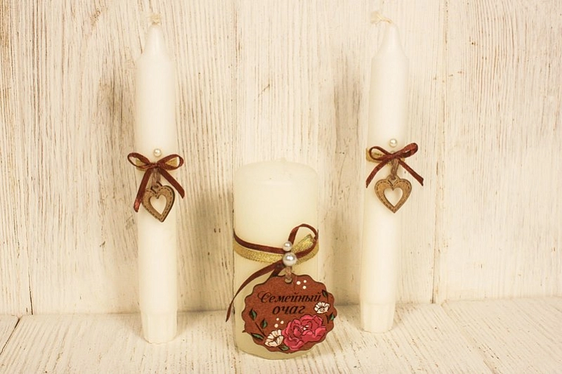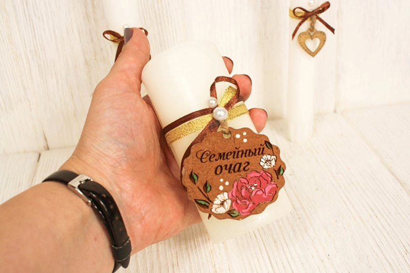 - Цветовая гамма: Сочетание дуба и розового цветов с золотыми акцентами придает свечам особый шарм и изысканность.