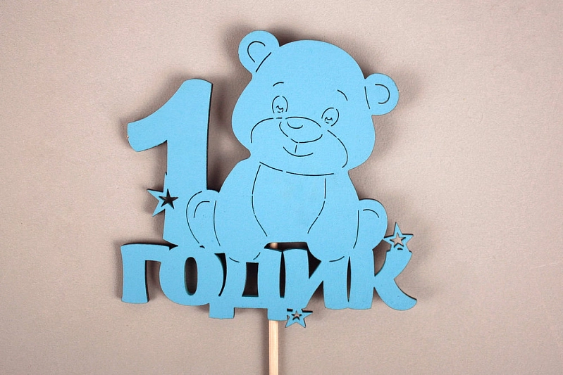 Топпер "1 годик" с мишкой (10*30) МДФ, окрашен. на шпажке, Голубой, 1 шт.