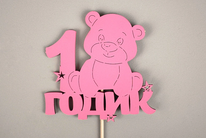 Топпер "1 годик" с мишкой (10*30) МДФ, окрашен. на шпажке, Розовый, Уп-10 шт.