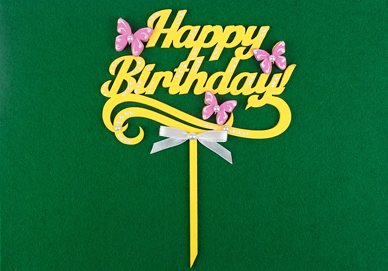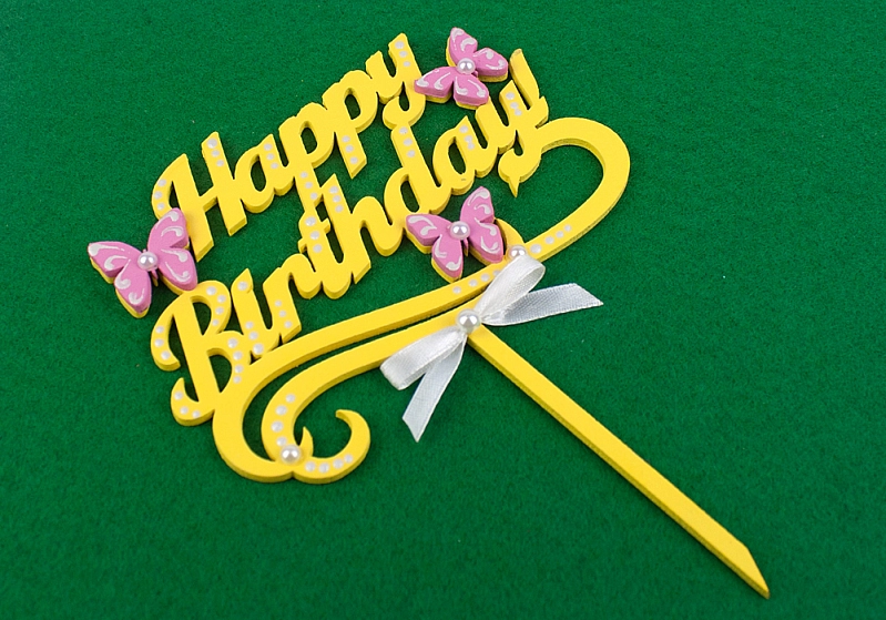 ТпТр10-05-1605 Топпер "Happy Birthday!" с бабочками (шир.14см;выс.18,5см) МДФ-3мм, окрашен., оформл., Желтый-розовый, 1 шт.