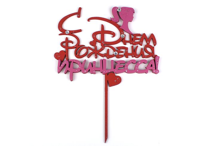 Топпер "С Днём Рождения, принцесса!" (шир.16,5см;выс.21см) МДФ-3мм, окрашен., оформл., Красный-малин