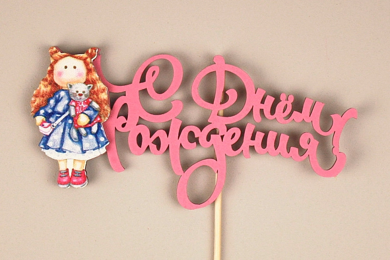 Топпер "С Днём Рождения!" с девочкой (13,5*26) МДФ 3мм, УФ печать, окраш., оформл., Розовый, Уп-10 шт.