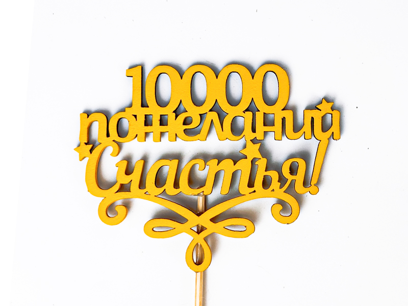 Топпер "10000 пожеланий счастья!" (10*27) МДФ, окрашен. на шпажке, Желтый, 1 шт.