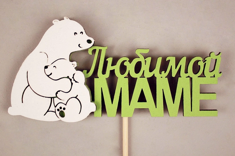 Топпер "Любимой маме" медведица с медвежонком (11,5*28) МДФ 3мм, окрашен. на шпажке, Салатовый-белый, 1шт.