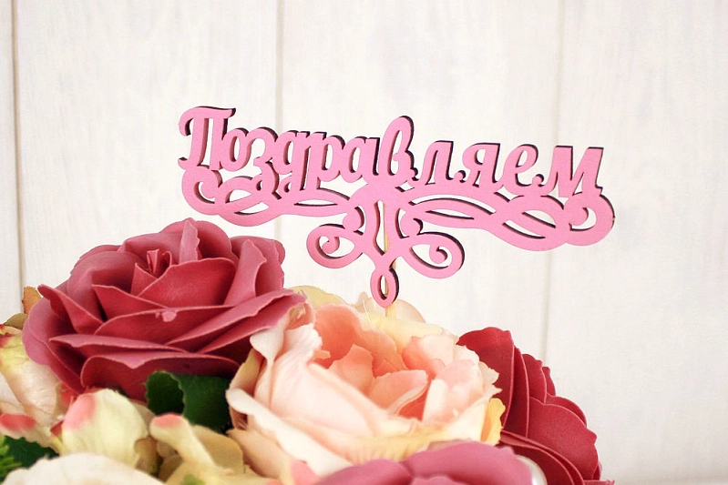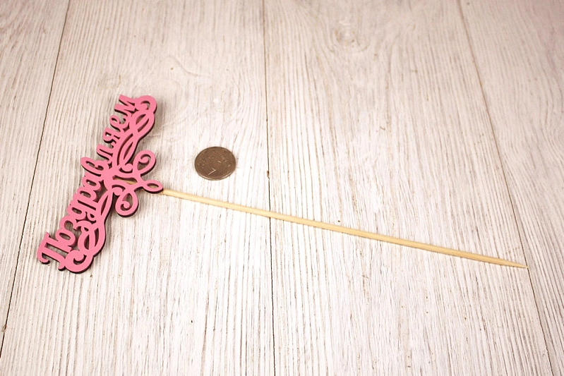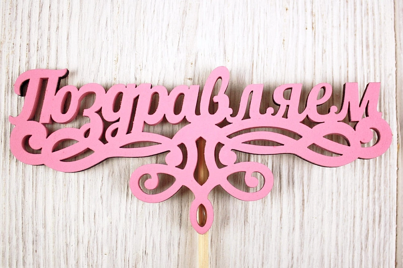 Топпер "Поздравляем!" (13*28) МДФ 3мм, окрашен. на шпажке, Розовый, 1 шт.