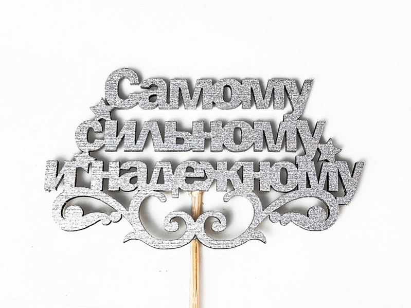 Топпер "Самому сильному и надёжному" (10*26) МДФ, окрашен. на шпажке, Серебро, 1 шт.