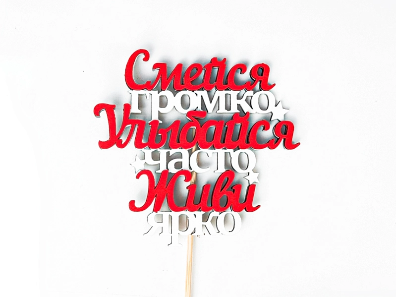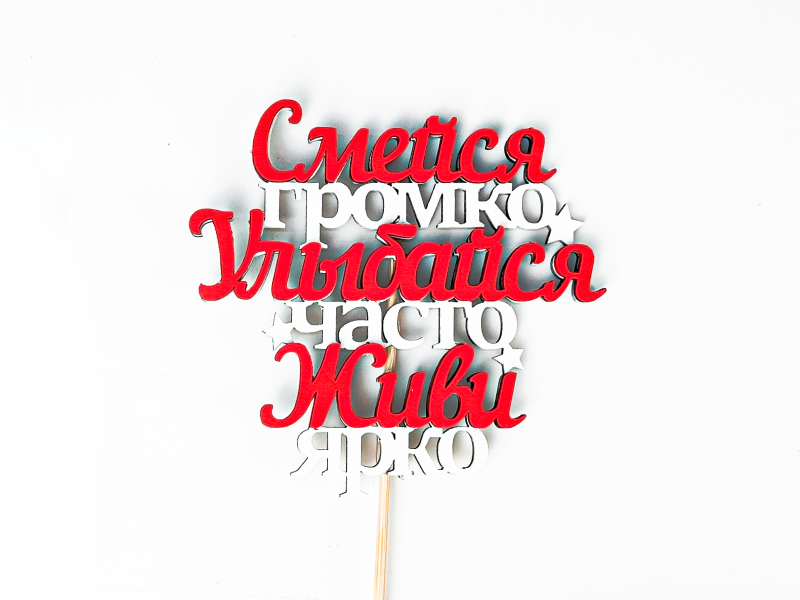 Топпер "Смейся, улыбайся, живи" (11*27) МДФ, окрашен. на шпажке, Белый-красный, 1 шт.
