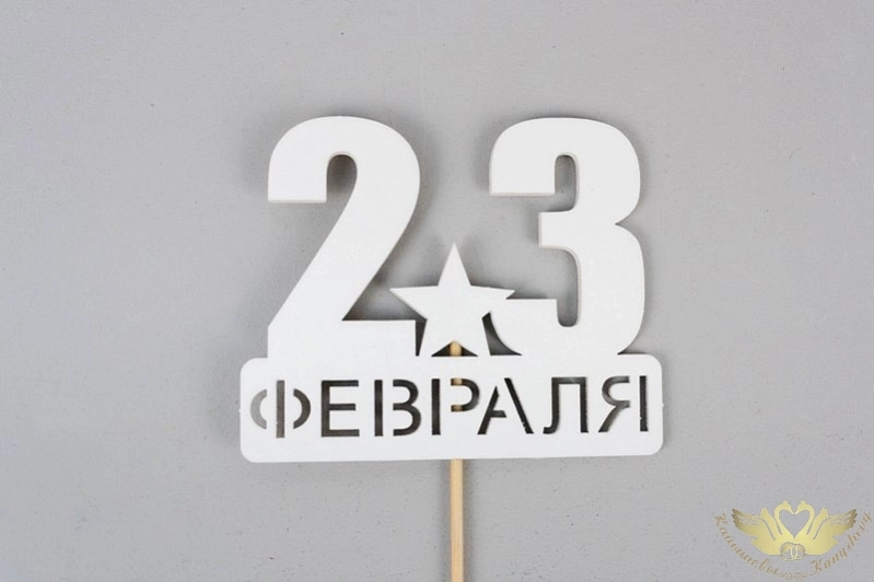 Топпер "23 февраля" со звездой (9*29) МДФ, окрашен. на шпажке, Белый, 1 шт.